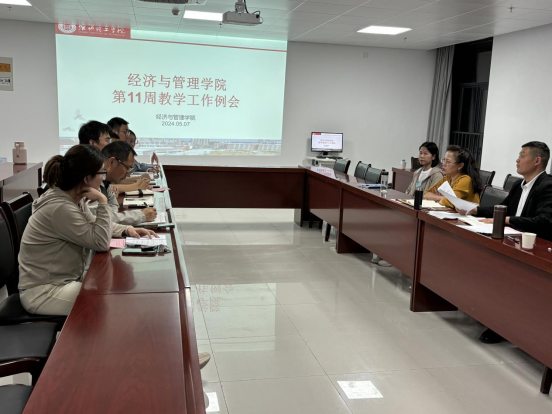 2024年5月7日,经济管理学院在新行政楼725召开第十一周教学行政例会,会议由院长吴玲主持,副院长秦品德、院长助理张珊、实训中心主任及各教研室主任参加会议。