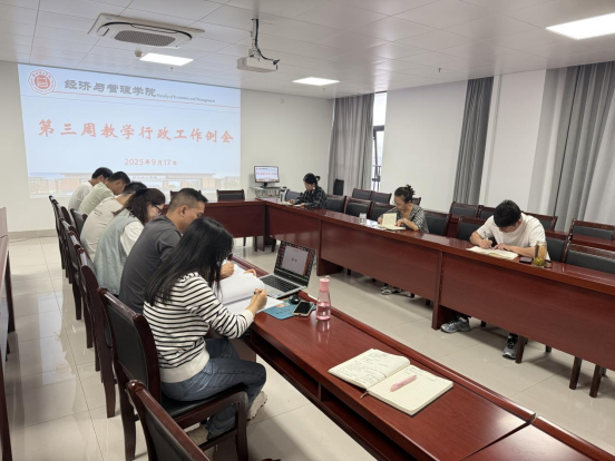 2025 年 9 月 17 日上午,beat365英国官网网站在行政楼 725 会议室召开第三周教学行政工作例会。院长吴玲主持会议,院长助理张珊、叶赵强,教学秘书李健,各教研室主任及相关行政人员参会。