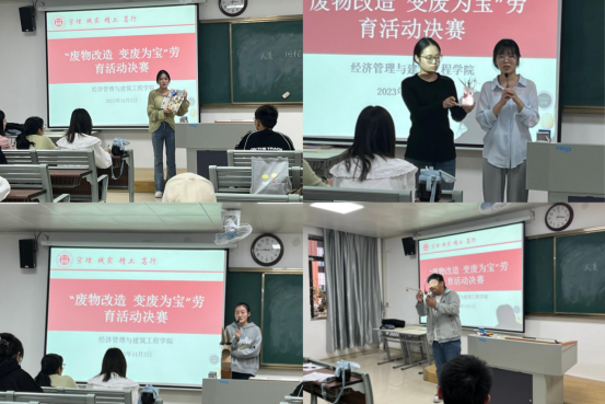 为了提高大学生的环保、创新意识,积极承担环保责任,提升大学生的动手能力,展现大学生的艺术风采,丰富劳动教育主题活动形式,我院于2023年10月28日——11月3日举办“废物改造•变废为宝”劳动教育主题活动。为充分调动同学们参与活动的积极性,激发同学们的参赛热情和创新实践精神,活动采用线上线下相结合的方式进行。初赛通过线上投递作品参赛,根据票选情况选取前十名进入决赛,决赛通过线下展示作品,根据评委老师对作品进行打分评选出作品获奖等级。