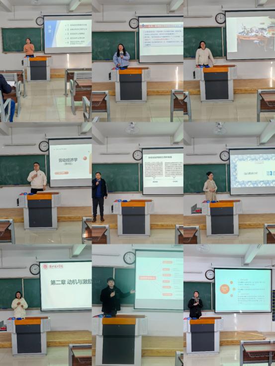 本次活动特邀银铃查道中教授与市场营销教研室刘路路主任担任评委,人力资源管理教研室11名教师依次登台展示教学风采。各位教师精心准备了课程大纲、课件及PPT,围绕专业核心知识点展开15分钟课堂教学展示,充分运用现代教育技术与多元教学方法,清晰呈现教学目标、重难点突破思路与课堂组织逻辑,展现了青年教师扎实的专业功底与积极进取的教学态度。