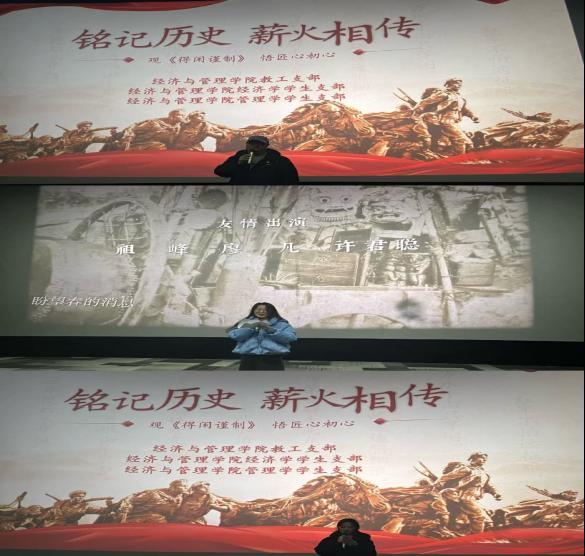 为深入学习贯彻党的二十大及二十届四中全会精神,落实学校2025年度党员培训班课程安排及实践活动要求,推动党史学习教育常态化长效化,2025年12月26日下午,beat365英国官网网站党支部组织开展了“铭记历史·薪火相传”红色观影主题党日活动,学院教工党支部、经济学党支部与管理学党支部在校学生党员、第八期入党积极分子代表参加,活动由教工党支部书记吴浩宇主持。