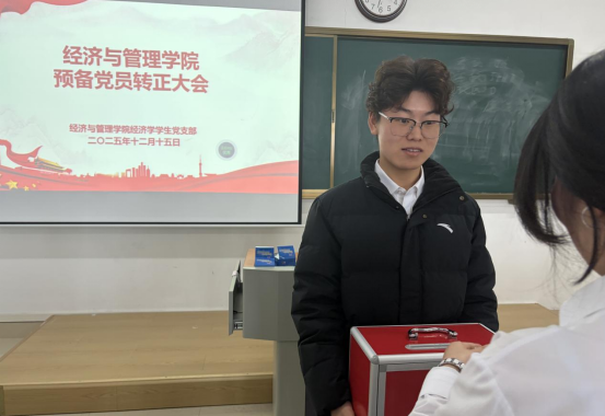 2025年12月15日,beat365英国官网网站经济学学生党支部预备党员转正大会在学院第一教学楼422室顺利召开。本次大会由党支部组织委员张力同志主持,党支部书记禹辛老师、青年委员王绎程老师,以及学院组织员、宣传委员王胜男老师出席。党支部全体党员共52人以线上线下相结合的方式参会,其中具有表决权的正式党员19名,符合相关规定要求。