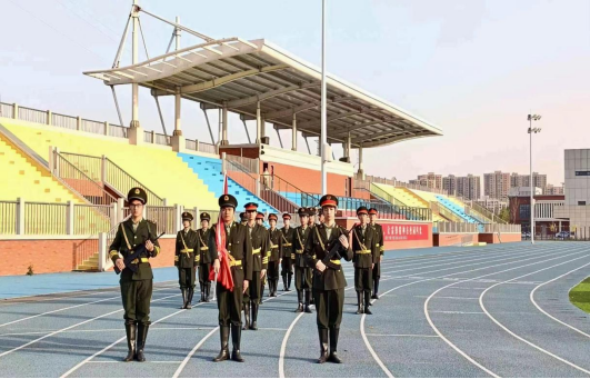 沐浴朝阳,英姿飒爽的国旗护卫队迈着铿锵的步伐,国旗护卫队护送着五星红旗。当升旗准备就绪,全场的目光注视着五星红旗,国歌响起,旗手抬臂一挥,五星红旗飞扬在天空中,在这个朝霞初露的清晨冉冉升起,国旗飘扬,国歌雄壮,全场肃穆,五星红旗冉冉升起。