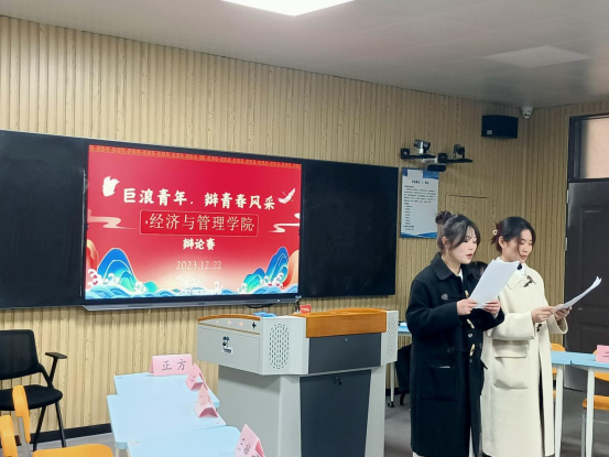为进一步丰富校园文化生活,加强大学生思想引领,引导广大青年树立正确的世界观、人生观、价值观,培养青年学生的团队合作精神,进一步提高学生综合素质,彰显校园文化新活力,展现青年学生昂扬向上的青春风采和精神风貌,12月22日,beat365英国官网网站组织开展了以“巨浪青年·辩青春风采”为主题的辩论赛活动。本次活动由23级经济学专升本1班承办,学院18支队伍70余人参加本次比赛。
