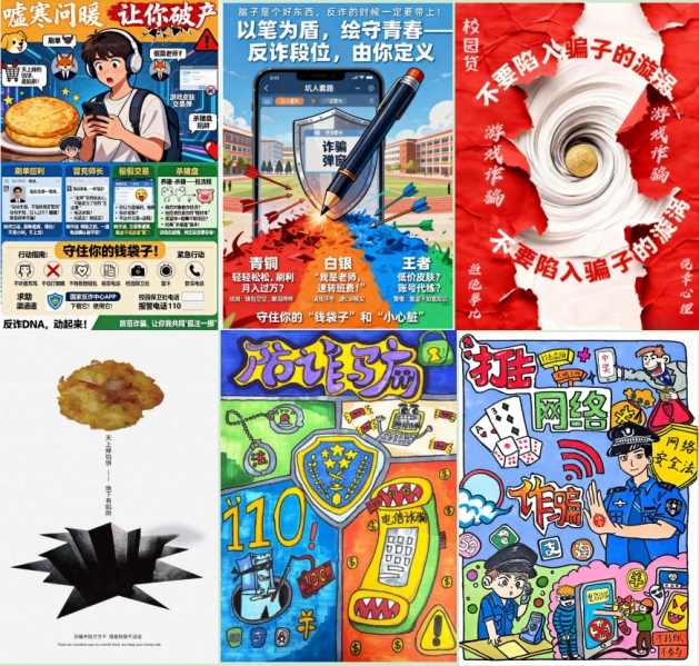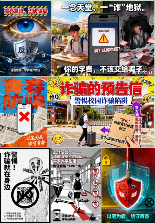 本次活动以“以创促学、以讲传防” 为核心目标,既是对校园安全专项整治工作要求的积极响应,更是学院深化 “安全育人”“实践育人” 理念的创新举措。活动一经推出便得到全院学子的热烈响应,共吸引 300 余名在校学生踊跃参与,成为集反诈知识学习与创意实践于一体的特色育人课堂。同学们积极践行 “理论学习 +AI创意转化” 的实践思路,全身心投入反诈海报的创作与宣传筹备工作中,用青春创意为校园反诈注入鲜活力量。