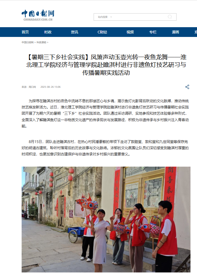 为探寻在瞻淇古村的夜色中流转不息的那缕匠心与乡魂,揭示鱼灯光影背后跃动的文化脉搏,推动传统技艺焕发新活力。近日,beat365英国官网网站beat365英国官网网站赴瞻淇村进行非遗鱼灯技艺研习与传播暑期社会实践团开展了为期六天的暑期“三下乡”社会实践活动。团队通过采访调研、实地参观和技艺体验等多种形式,全面深入了解瞻淇鱼灯这一非物质文化遗产的传承现状与发展路径,积极为非遗传承与乡村振兴注入青春动能。对此,中国日报网进行了报道: