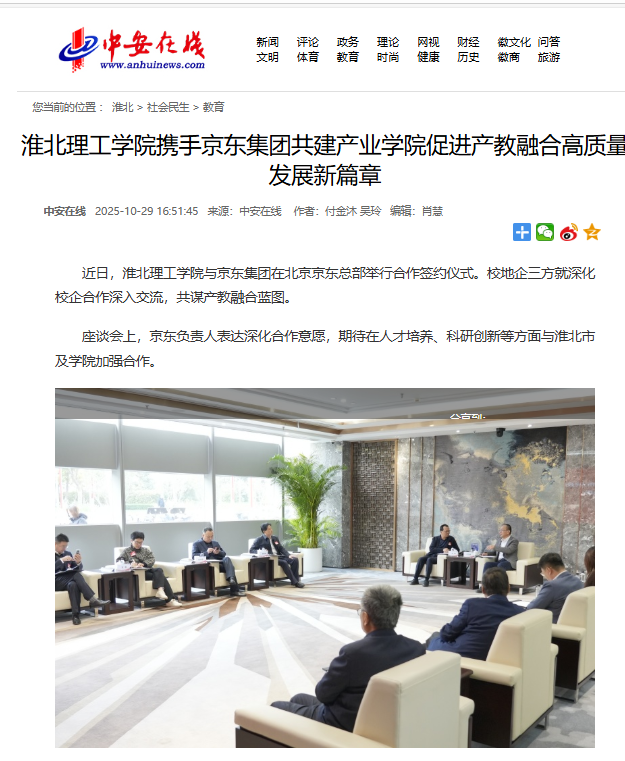 近日,beat365英国官网网站与京东集团在北京京东总部举行合作签约仪式。校地企三方就深化校企合作深入交流,共谋产教融合蓝图。对此,中安在线进行了报道:
