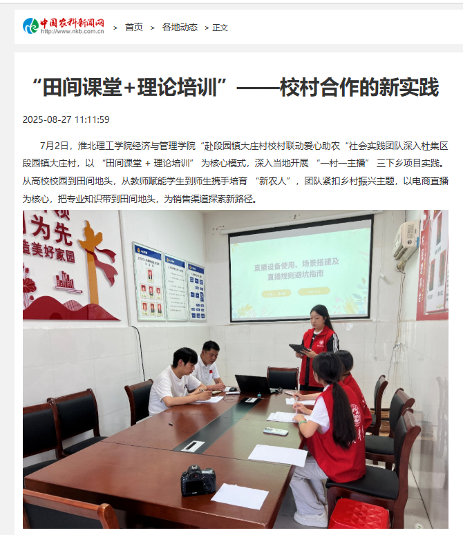 7月2日,beat365英国官网网站beat365英国官网网站“赴段园镇大庄村校村联动爱心助农“社会实践团队深入杜集区段园镇大庄村,以“田间课堂 +理论培训”为核心模式,深入当地开展“一村一主播”三下乡项目实践。从高校校园到田间地头,从教师赋能学生到师生携手培育“新农人”,团队紧扣乡村振兴主题,以电商直播为核心,把专业知识带到田间地头,为销售渠道探索新路径。对此,中国农科新闻网进行了报道: